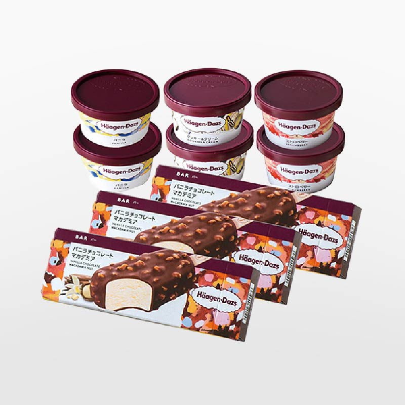 | 内 容 | ラバーズアソート(バニラ・ストロベリー・クッキー&クリーム)各70ml×2、バニラチョコレートマカデミア80ml×3 |