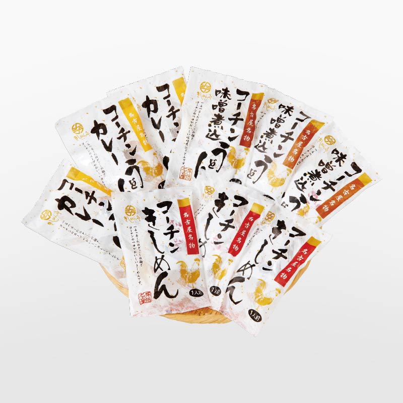 | 内 容 | コーチンカレーうどん(うどん80g、スープ35g)×3、コーチン味噌煮込うどん(うどん80g、あじみそ50g)×3、コーチンきしめん(きしめん80g、めんつゆ25g)×3 |