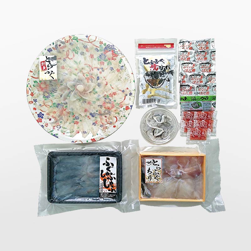 | 内 容 | とらふぐ刺身70g(プラスチック皿)、とらふぐちり200g、まふぐしゃぶ50g、とらふぐ皮刺20g、とらふぐ焼ひれ3g、鍋のつゆ20g、ぽん酢15g・もみじおろし3g×各5 |