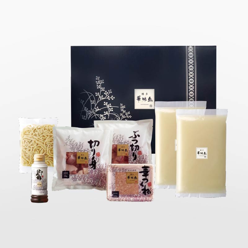 | 内 容 | 水たき生スープ600g×2、華味鳥 切り身300g×1、華味鳥 ぶつ切り300g×1、華つくね200g×1、ちゃんぽん麺150g×1、博多ぽん酢220ml×1 |