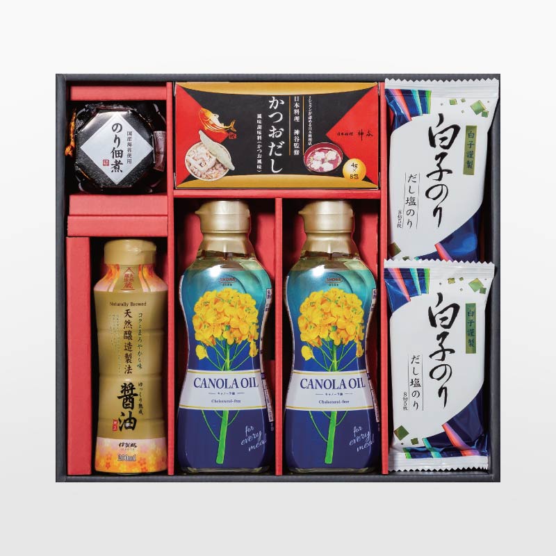 | 内 容 | 昭和キャノーラ油300g×2、伊賀越天然醸造醤油200ml、のり佃煮80g、かつおだし4g×8、白子だし塩のり8切5枚×2 |