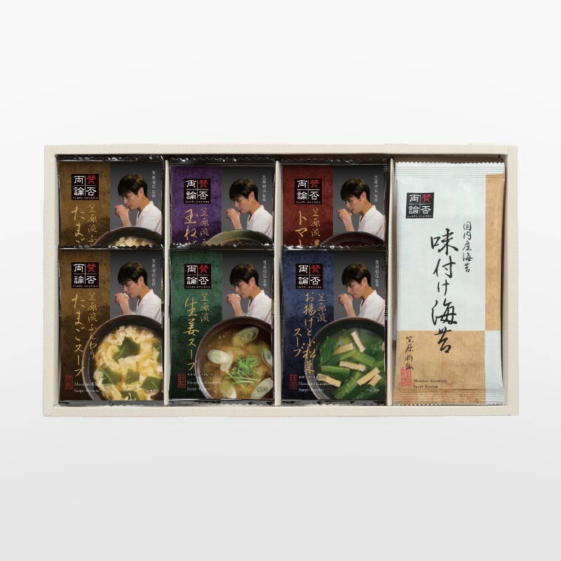 東京恵比寿の予約のとれない人気店〈賛否両論〉笠原店主が監修したお湯を注ぐだけで簡単に本格スープが楽しめるフリーズドライスープと味付け海苔がセットされたギフトです。