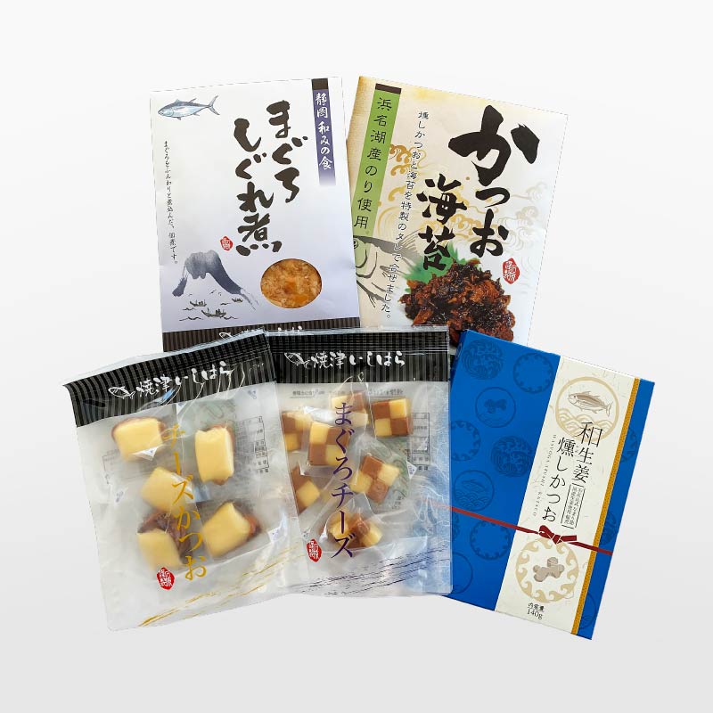 | 内 容 | チーズかつお90g、まぐろチーズ70g、和生姜燻しかつお140g、かつお海苔150g、まぐろしぐれ煮120g |