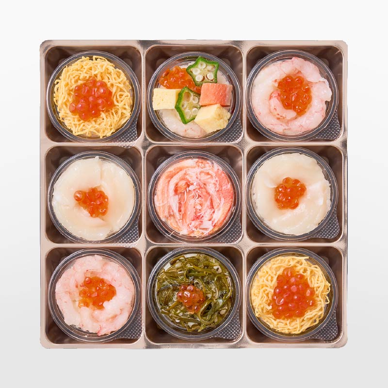| 内 容 | 帆立いくら・甘えびいくら・卵いくら 各40g×各2、彩り・かに・めかぶいくら 各40g×各1(計9) |