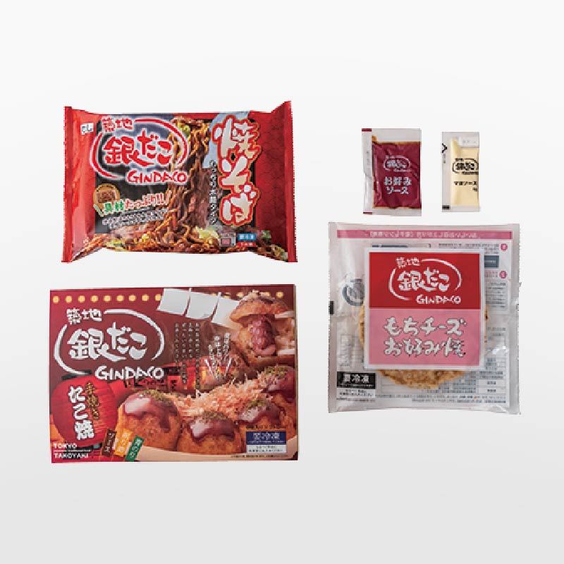 築地銀だこ店舗と同様に一玉一玉丁寧に手焼きした冷凍たこ焼と、モチモチ生麺タイプの中太麺を使用した冷凍焼そば、中にお餅とチーズを挟み込んだ冷凍お好み焼のセットです。