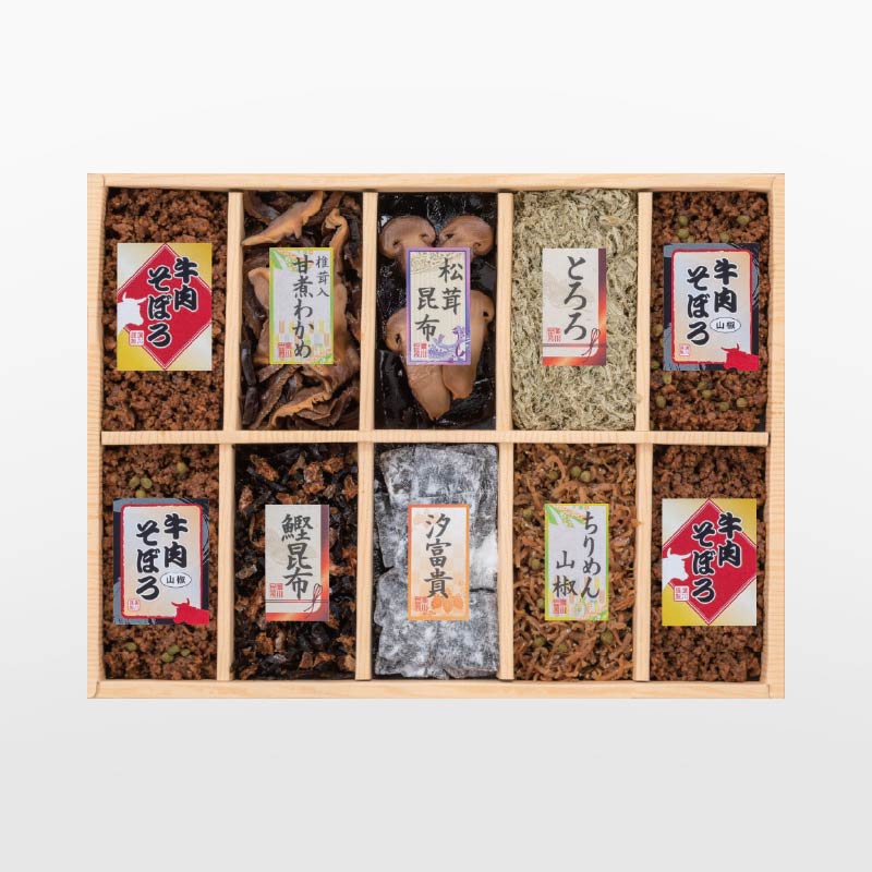 | 内 容 | 椎茸入甘煮わかめ45g、国産牛肉そぼろ・国産牛肉そぼろ(山椒)各40g×各2、松茸昆布40g、ちりめん山椒30g、汐富貴20g、鰹昆布18g、とろろ昆布8g |
