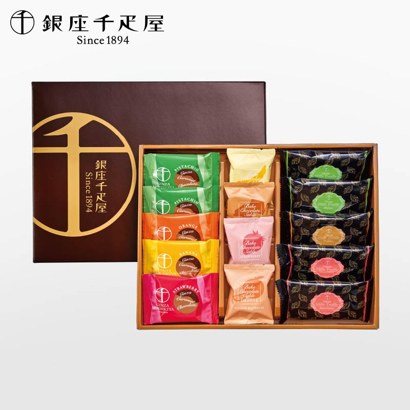 | 内 容 | 銀座ミルフィーユ(メロン・ストロベリー×各2、プラリネ×1)、銀座焼きショコラサブレ(オレンジ・ストロベリー・バナナ・キャラメル×各1)、銀座キャラメルショコラ(ピスタチオ×2、ストロベリー・バナナ・オレンジ×各1) |