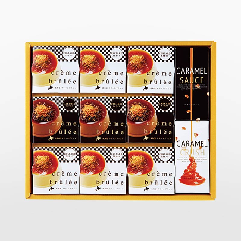 | 内 容 | クリームブリュレ72g×6、クリームブリュレキャラメル74g×3、カラメルソース5g×9、カラメルクラッシュ2g×9 |